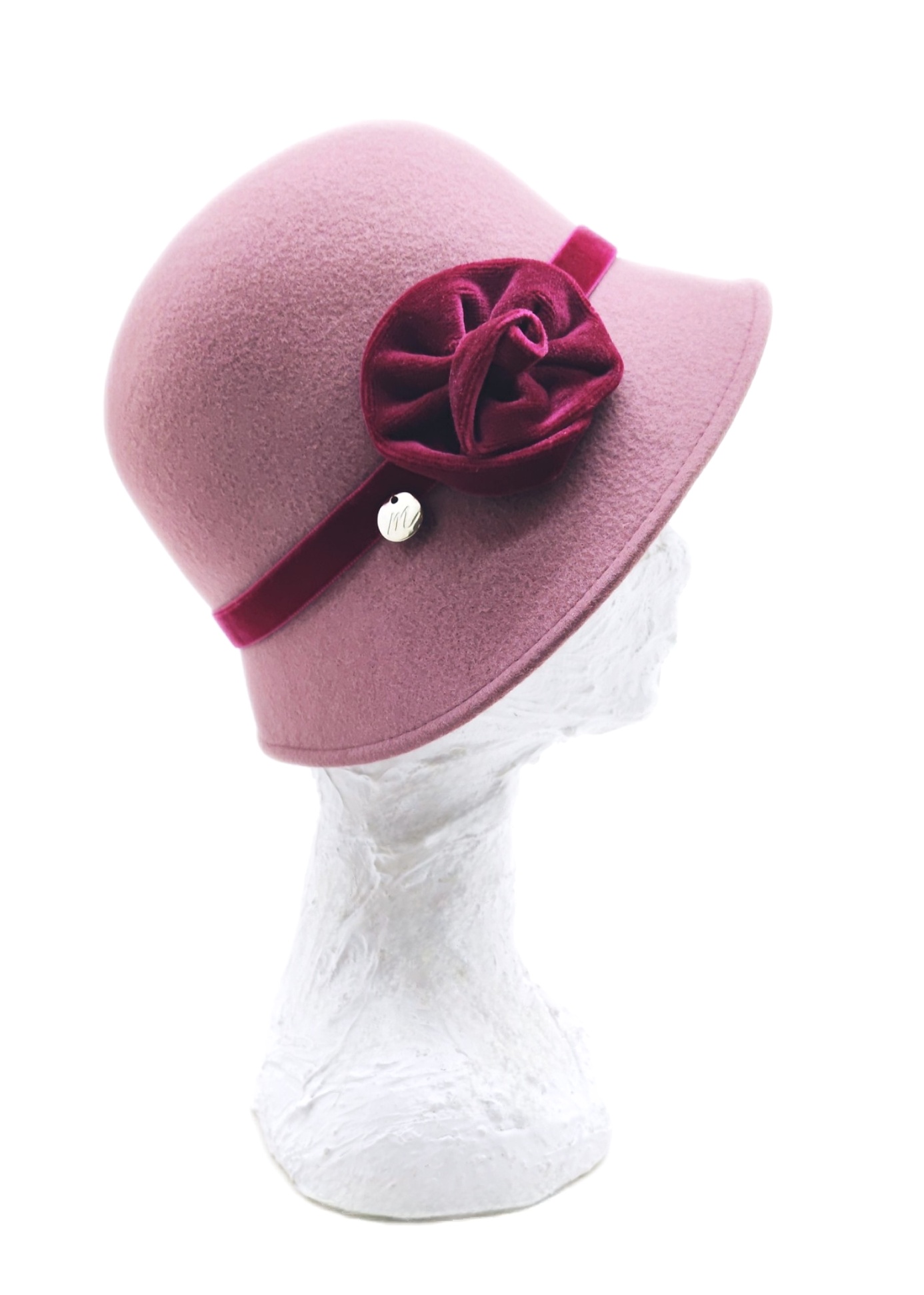 CLOCHE FELTRO ROSA MALVA CON CINTURINO E FIORE IN VELLUTO