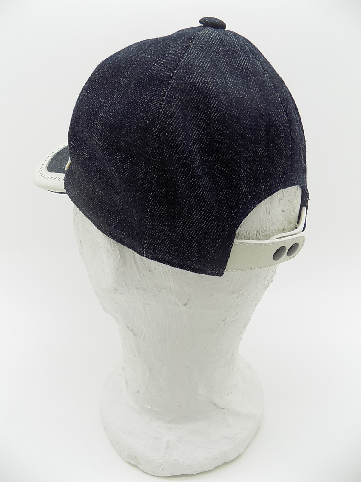 Baseball in jeans di cotone di colore blu scuro, con finiture in cuoio bianco di Luca Della Lama.