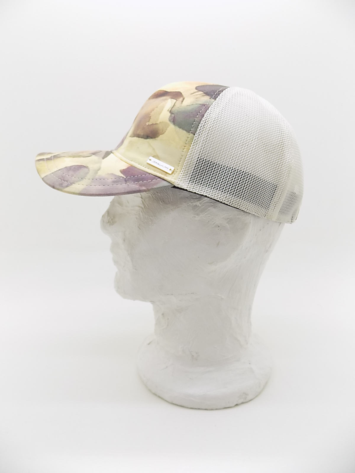 Baseball in pelle di agnello e poliestere, con fantasia dipinta a stampa digitale e retina bianca sul retro. Traspirante, leggero ed estremamente particolare. Una piccola opera d'arte prodotta da Luca Della Lama.