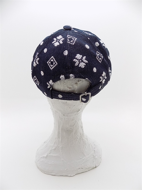 Cappello da donna modello Fantino, in jeans di cotone di colore blu scuro, con ricami in fantasia geometrica bianca. Modello fresco, informale e sbarazzino. Realizzato in Italia da Luca della Lama.