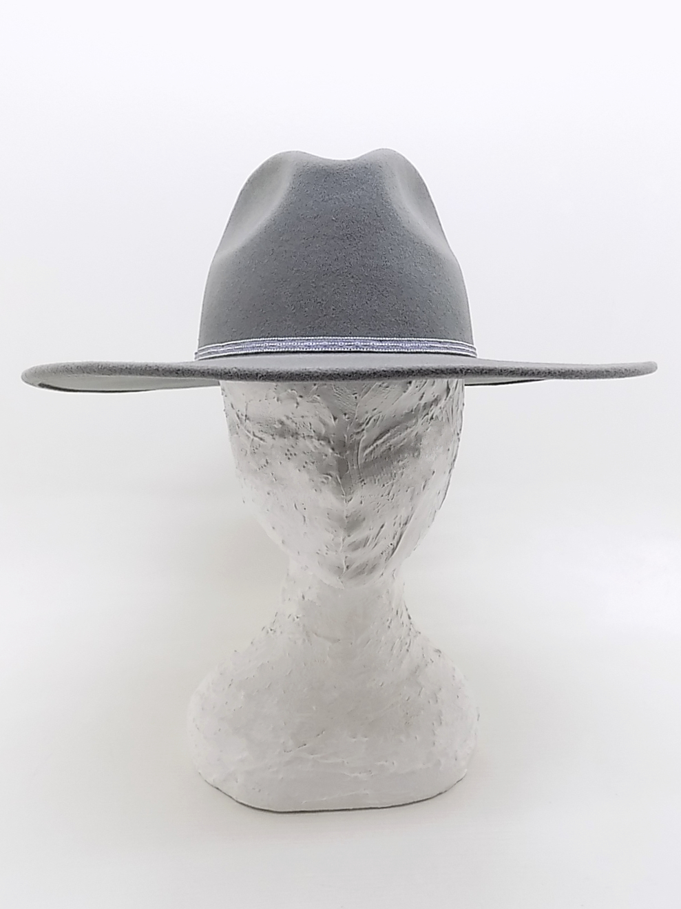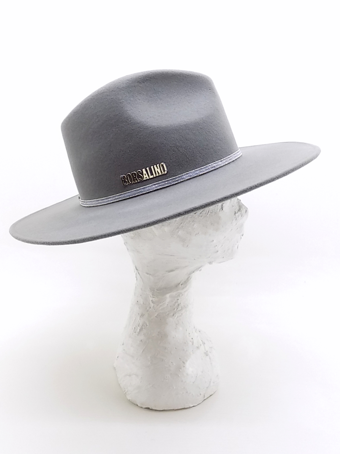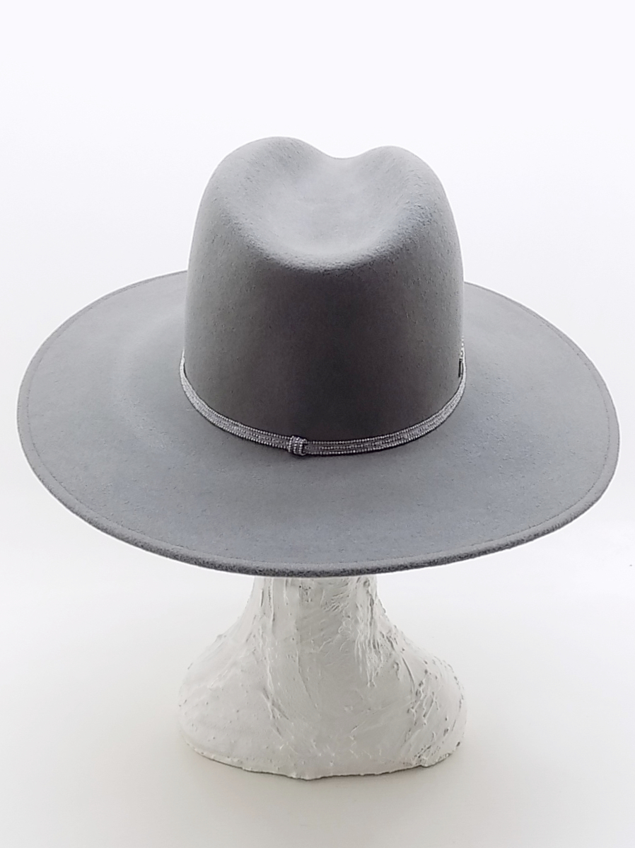 Cappello da donna a tesa larga (9 cm) modello Andrea, realizzato in un pregiato feltro di lana di colore grigio. Il copricapo è impreziosito dal sottile cinturino in strass e, posto di lato, dal logo Borsalino in metallo galvanizzato con lettere a blocchi. L'interno del cappello è sfoderato.