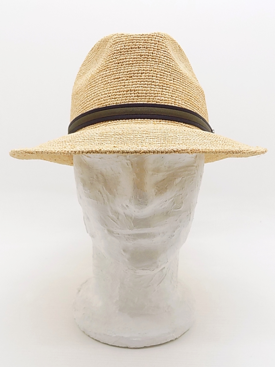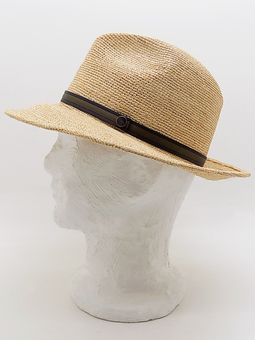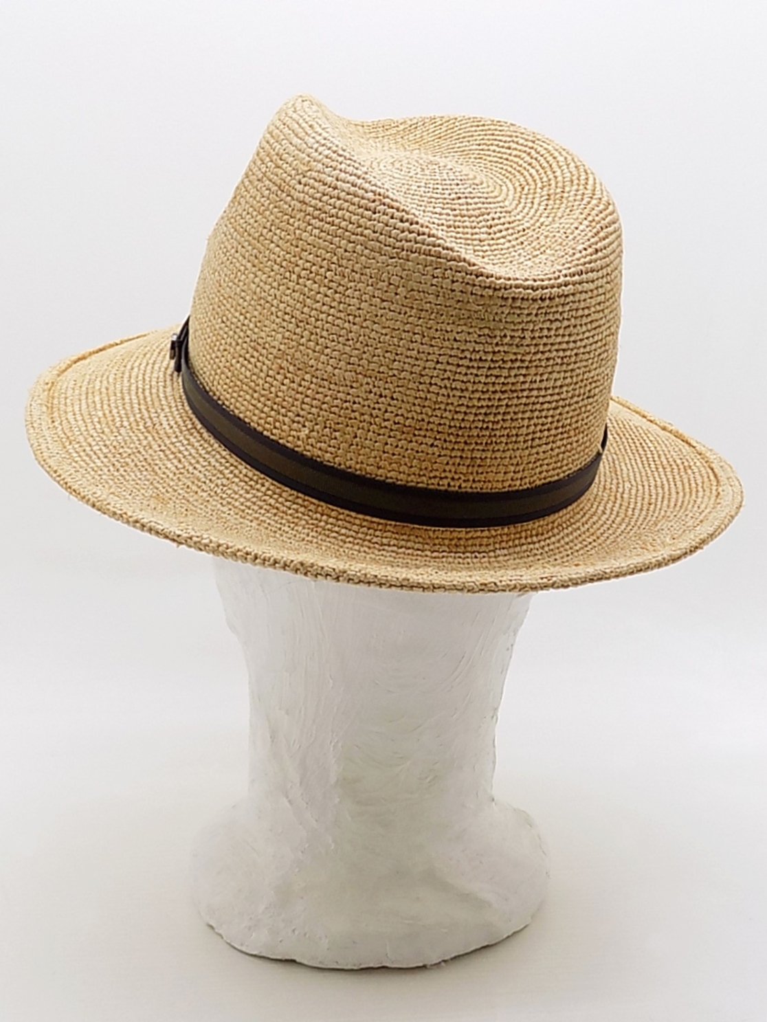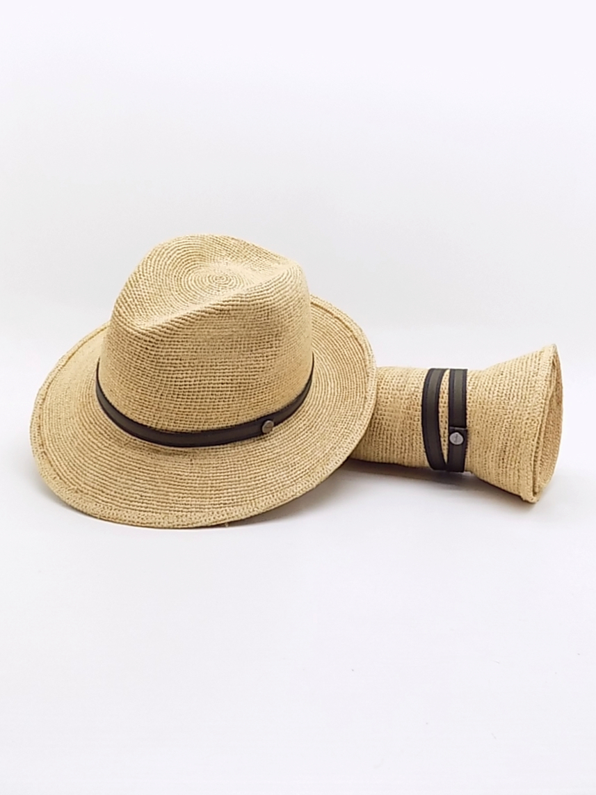 Cappello modello Argentina Rafia Crochet, realizzato in 100% rafia di colore beige naturale intrecciata artigianalmente a mano con l'uso di un uncinetto. La lavorazione crochet dona al copricapo una trama leggera e traspirante e la perfetta flessibilità per essere arrotolato. L'interno è sfoderato, la tesa è larga circa di 6,5 cm e, a completare il distintivo design, troviamo il sottile cinturino bicolore (nero e beige scuro) con bottone automatico utile per richiuderlo una volta arrotolato. Copricapo dallo stile classico e innovativo allo stesso tempo, la scelta ideale sia per uomo che per donna. Il made in Italy firmato Borsalino.