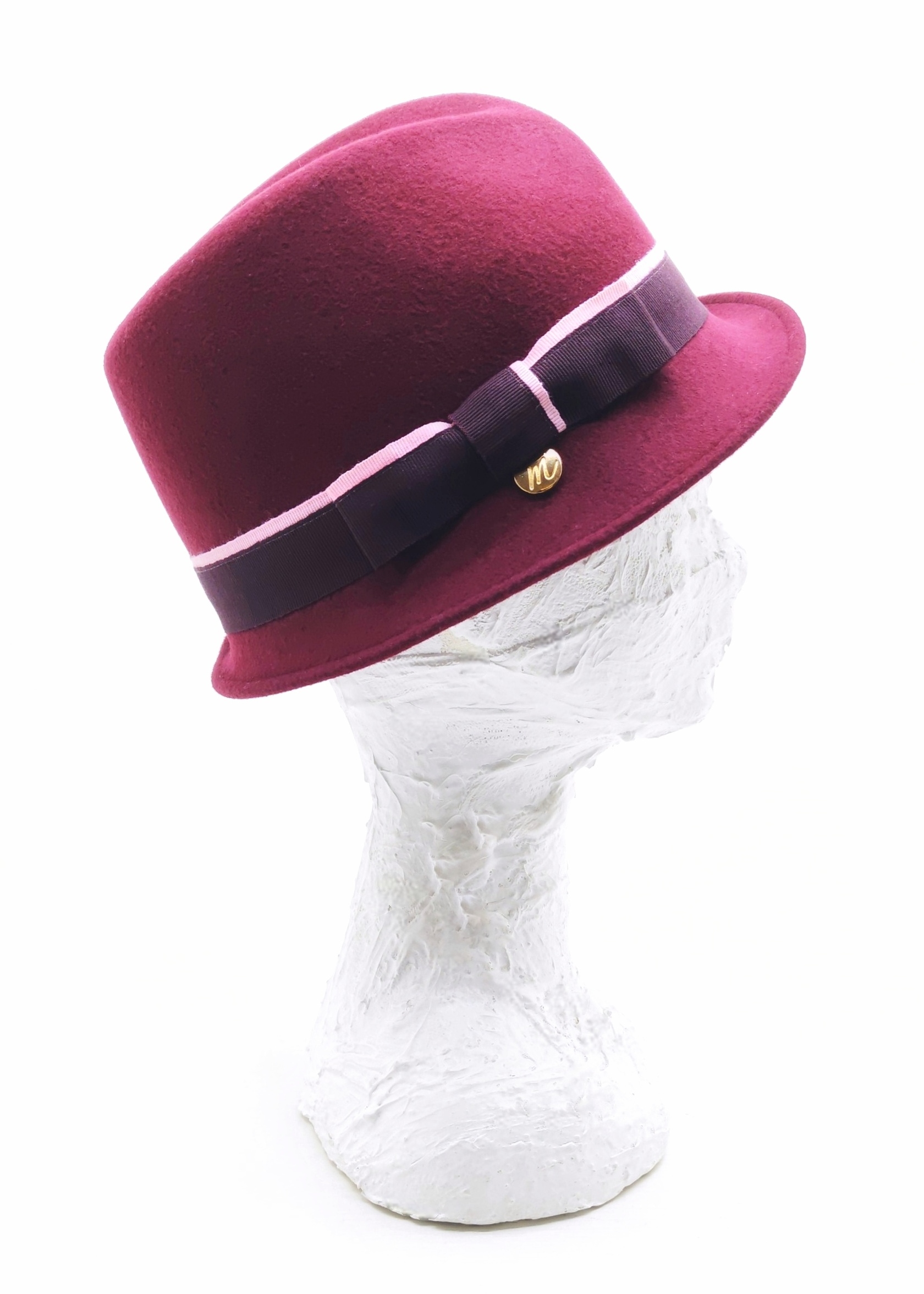 Cappello da donna a tesa piccola modello Fedora. Realizzato in 100% feltro di lana di colore bordeaux, è caratterizzato dalla tesina asimmetrica e dal nastro in gros-grain bicolore bordeaux e rosa. Un accessorio di stile e carattere, originale e raffinato allo stesso tempo. Il made in Italy firmato Rossomenta.