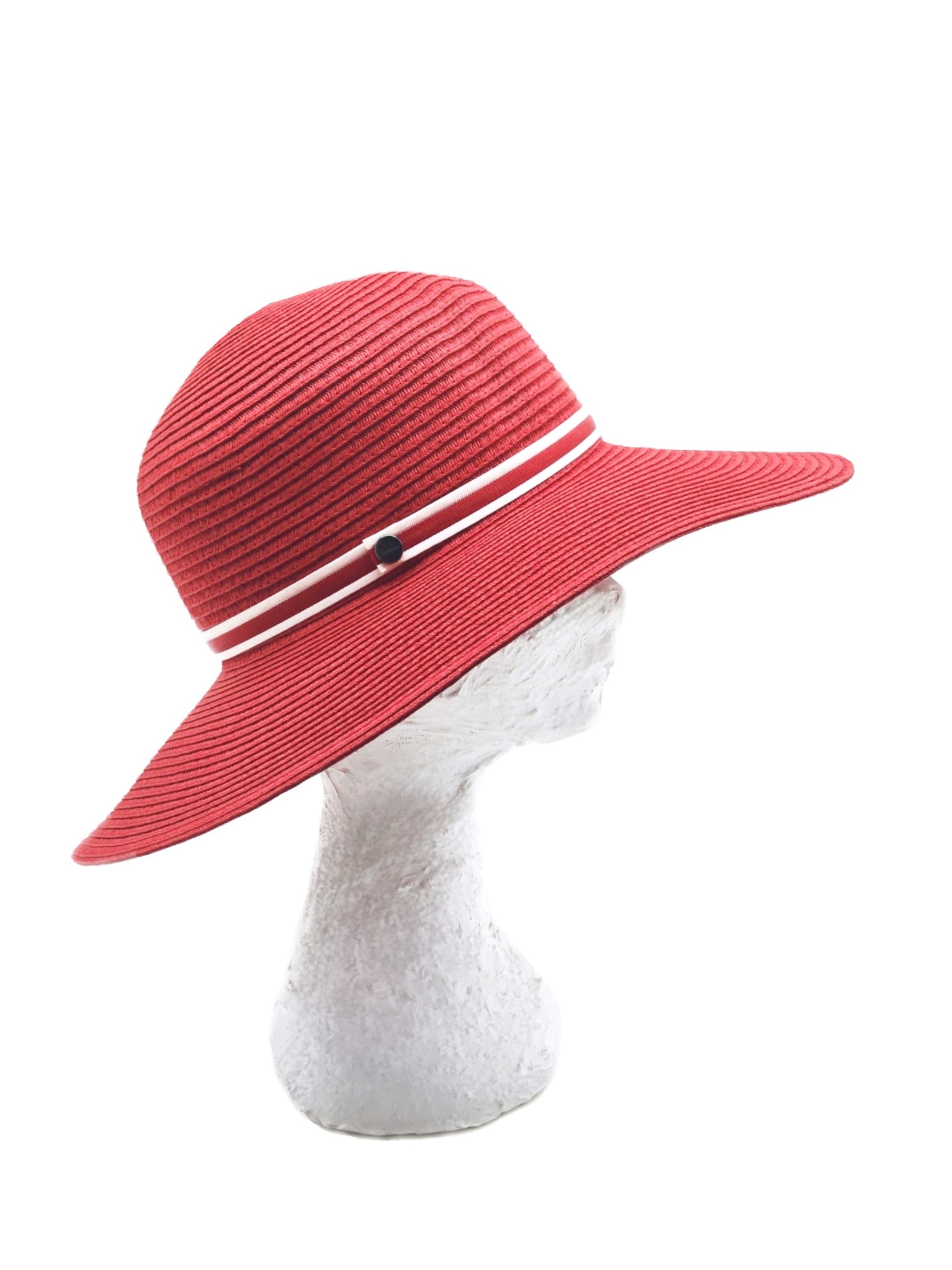 Cappello da donna arrotolabile modello Giselle Treccia Carta, di colore rosso. A caratterizzarlo la tesa molto ampia e coprente (9 cm) e il sottile nastro bicolore a righe bianche e nere con bottone automatico, utile per richiuderlo una volta arrotolato. E' un accessorio unico e innovativo, realizzato in fibre di carta tessile sapientemente intrecciate e lavorate in modo da garantire un'ottima resistenza e una grande flessibilità. Un copricapo comodo e versatile che può essere portato sempre con sé, pronto per essere indossato in qualsiasi momento, compagno ideale di tutti viaggi. Lo stile inconfondibile del made in Italy firmato Borsalino.