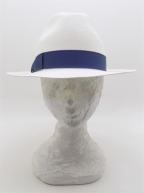 Cappello modello Panama Fine a tesa media. Realizzato in paglia intrecciata di colore bianco, con nastro e fiocco a contrasto di colore blu e logo dorato di Borsalino. Copricapo classico, ma dallo stile sicuro e deciso.