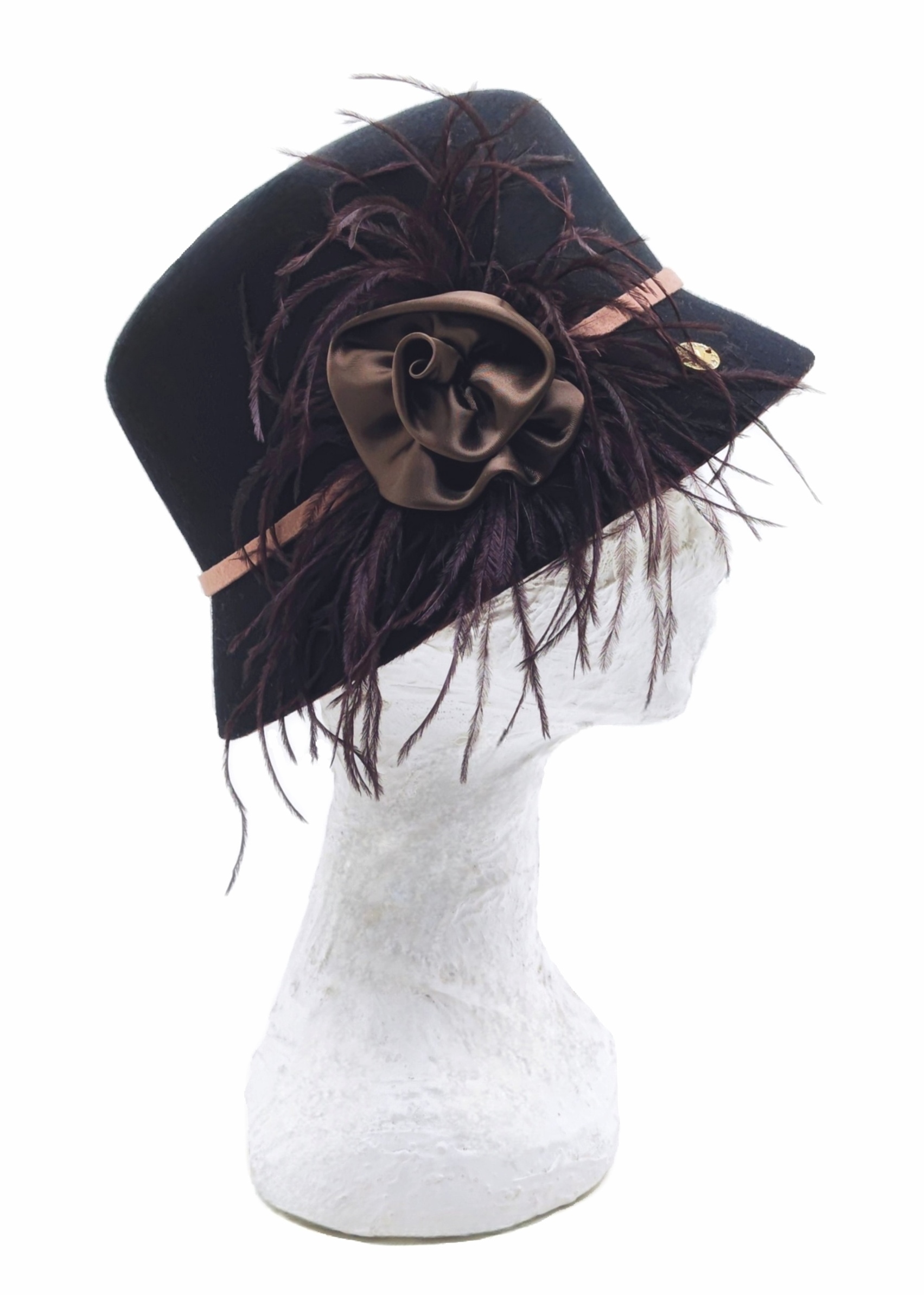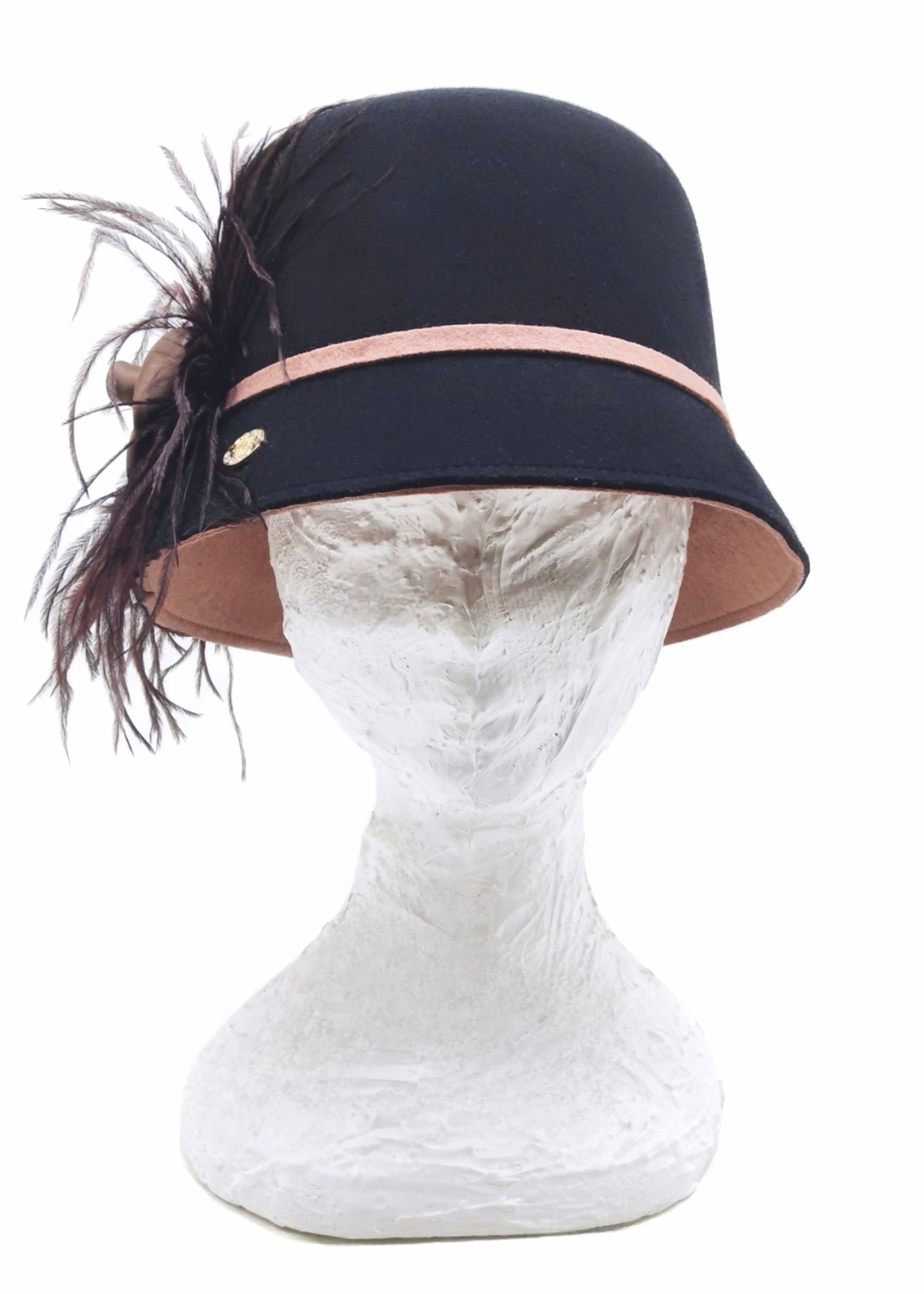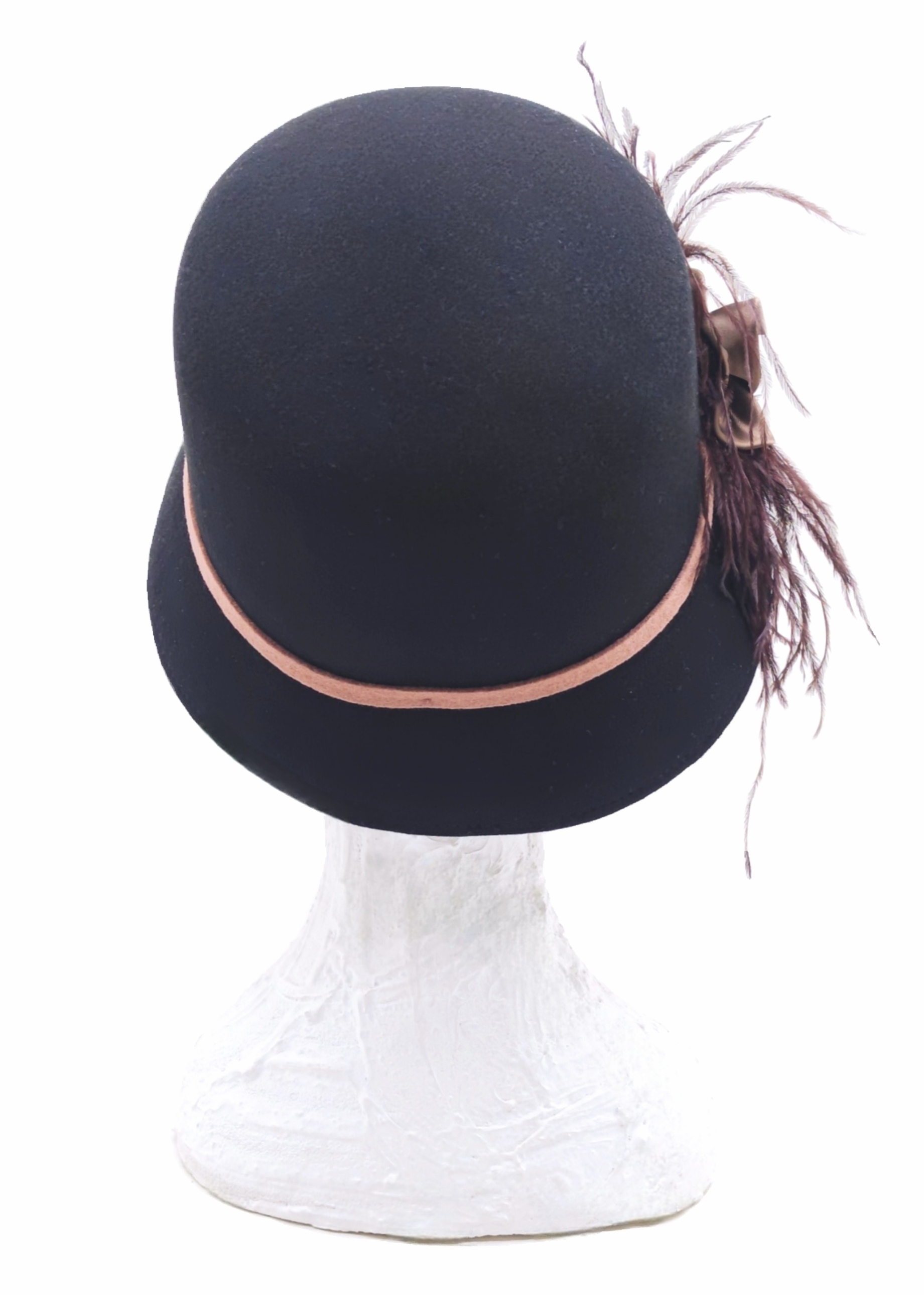 Cappello da donna modello Cloche in 100% feltro di lana bicolore nero e rosa-tortora. Arricchito dal sottile girotesta in feltro e impreziosito dal fiore in raso e dalle piume di marabù applicate a mano. Un accessorio raffinato e di tendenza, che rappresenta appieno l'artigianalità del made in Italy firmato Rossomenta.