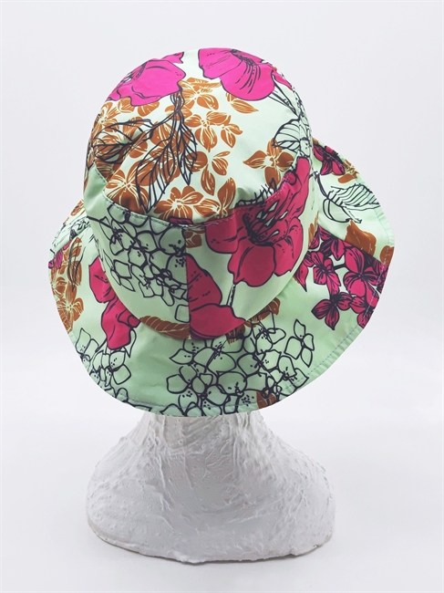 Cappello da donna modello Cloche, foderata e con ampia visiera asimmetrica. Realizzata in nylon in una brillante fantasia floreale fucsia e marrone su fondo verde acqua. Un copricapo vivace e originale, perfetto anche per le giornate di pioggia, firmato Rossomenta.