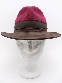 Cappello da uomo modello Australiano a tesa media. La parte alta del copricapo è in feltro di colore bordeaux, la falda è realizzata in pelle con imp ...