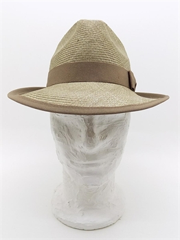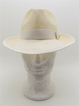 Cappello da uomo modello Victor. Realizzato in misto lino di colore bianco e nero, con profili e cinturino in cuoio vegetale nero. Di lato ad arricch ...