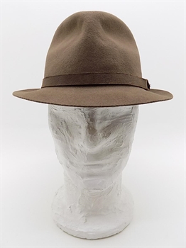 Cappello da uomo modello Fedora in feltro di pelo di colore marrone, con tesa larga 6,5 cm circa. Arricchito da nastro, fiocco e bordino in gros-grai ...
